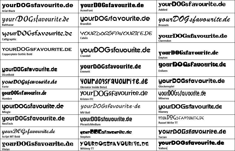 Folgend findest du noch eine Übersicht unserer Schriftarten, aber wie gesagt, so ziemlich jede Schrift ist möglich.