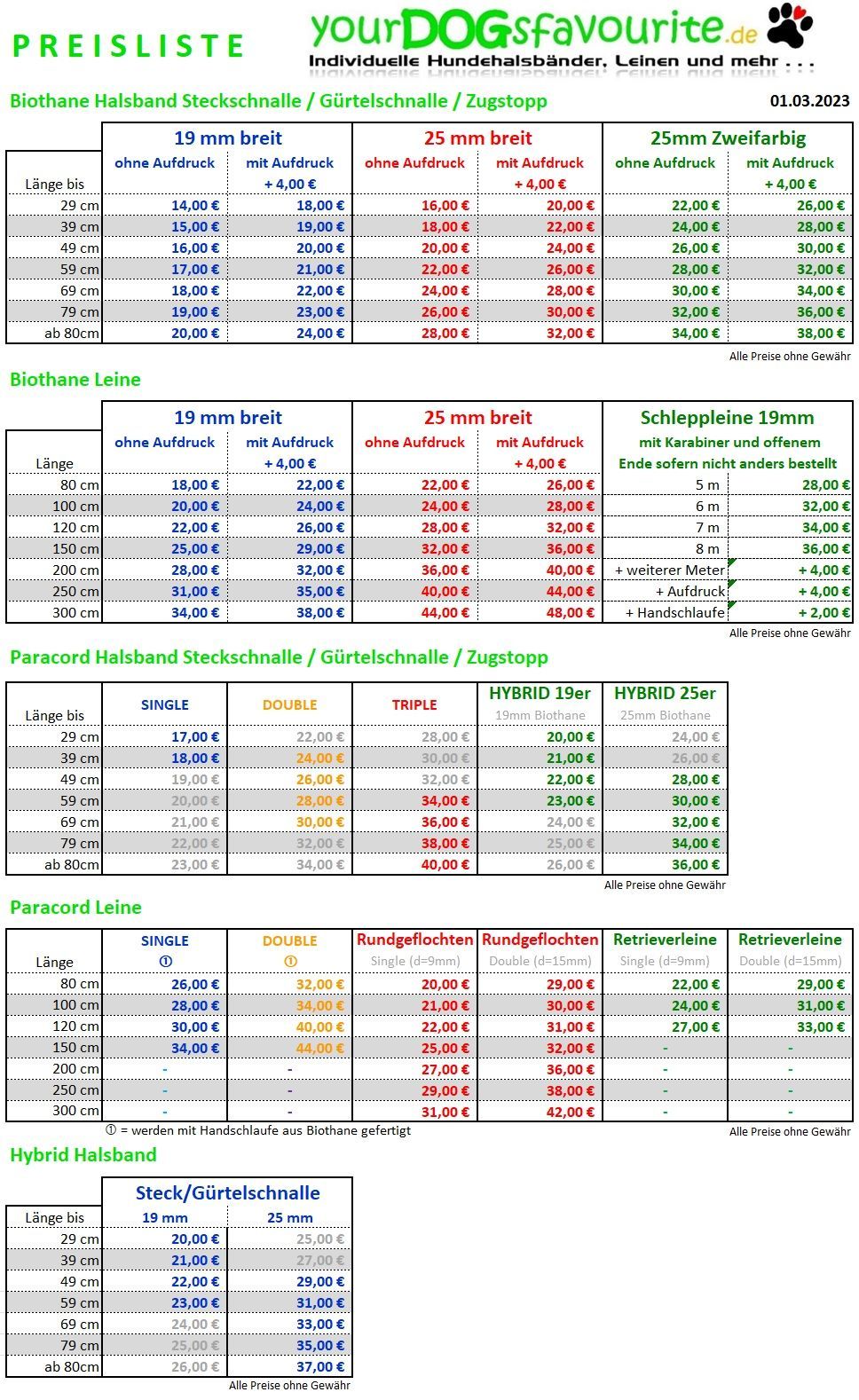 Farbübersicht und Preisliste